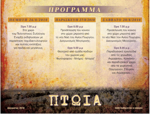Από σήμερα και για 6 μέρες στο προαύλιο χώρο του δημοτικού σχολείου, μας περιμένουν οι εκδηλώσεις «ΣΤΕΙΡΙ- ΠΟΛΙΤΙΣΤΙΚΟΣ ΑΥΓΟΥΣΤΟΣ 2010» που διοργανώνουν όλοι οι φορείς του χωριού. Όλοι θα είμαστε εκεί, σε αυτή τη διαφορετική βδομάδα, που έχει δημιουργήσει τη δική της παράδοση επιτυχίας εδώ και 27 χρόνια.